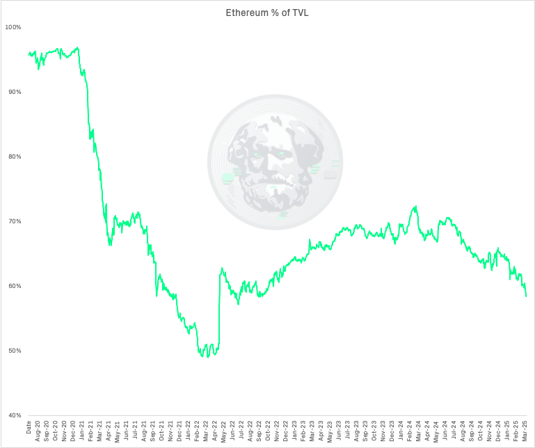 Looking at Ethereum's percentage of total TVL across all chains reveals a nuanced picture. After starting with over 95% market dominance in early 2021, Ethereum experienced a gradual decline to approximately 60% by early 2025. However, this doesn't represent the exodus some analysts predicted.