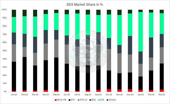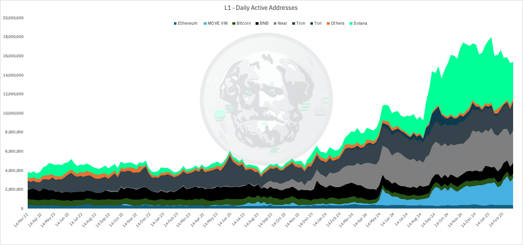 MOVE VM chains show measurable but modest activity despite significant investment, while Near Protocol displays breakthrough growth in late 2024. TON shows limited traction despite Telegram integration, and the "Others" category remains relatively small, contradicting the notion that the market is fragmenting among many specialised chains.