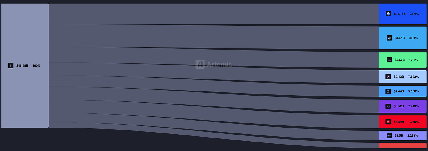 The TVL distribution chart (showing Ethereum at $11.15B, ETH L2s at $14.1B, with other chains holding smaller portions) reveals how the roll-up thesis has partially succeeded. Transaction activity has indeed moved to L2s, but crucially, these L2s remain connected to Ethereum rather than existing as independent ecosystems.