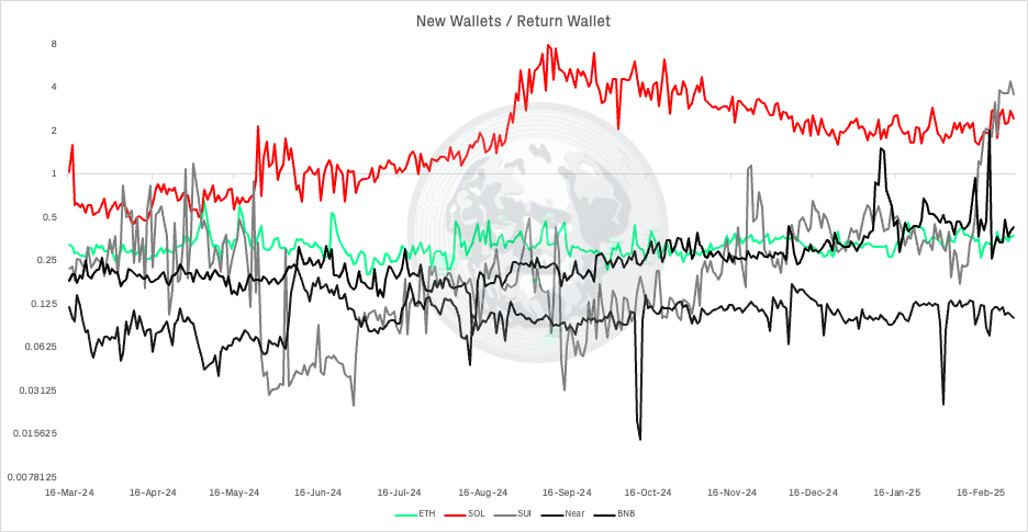 Ethereum maintains the lowest ratio (0.1-0.2 new wallets per returning wallet), reflecting its mature ecosystem focused on serving existing users.