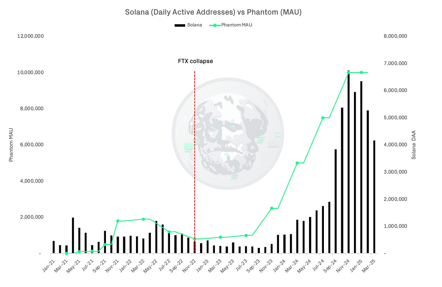 What's remarkable is Solana's recovery. As FTX's influence waned, Phantom wallet emerged as the new distribution channel. With over 10 million monthly active users (MAU), Phantom became the gateway through which new users entered the Solana ecosystem. By prioritising user experience and simplification, Phantom recreated what Solana had lost: a low-friction path for mainstream users to access the network.