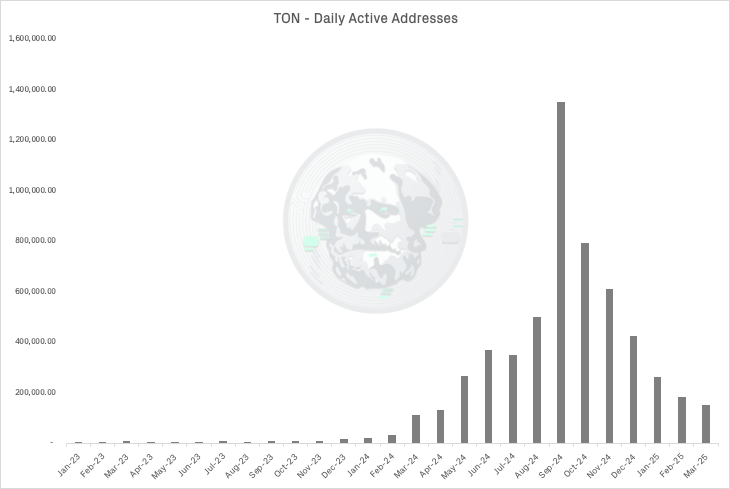 While TON saw significant spikes in activity during 2024—peaking at approximately 1.3 million daily active addresses in September 2024 before declining—these numbers represent only a tiny fraction of Telegram's massive user base. Despite direct integration with one of the world's largest messaging platforms, TON has managed to convert less than 0.2% of Telegram users into active blockchain participants.