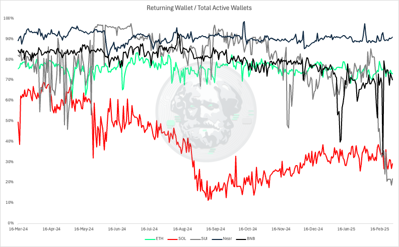 Blockchain ecosystem success depends on both acquisition and retention. Looking at returning wallet percentages from March 2024 to February 2025 reveals telling patterns: