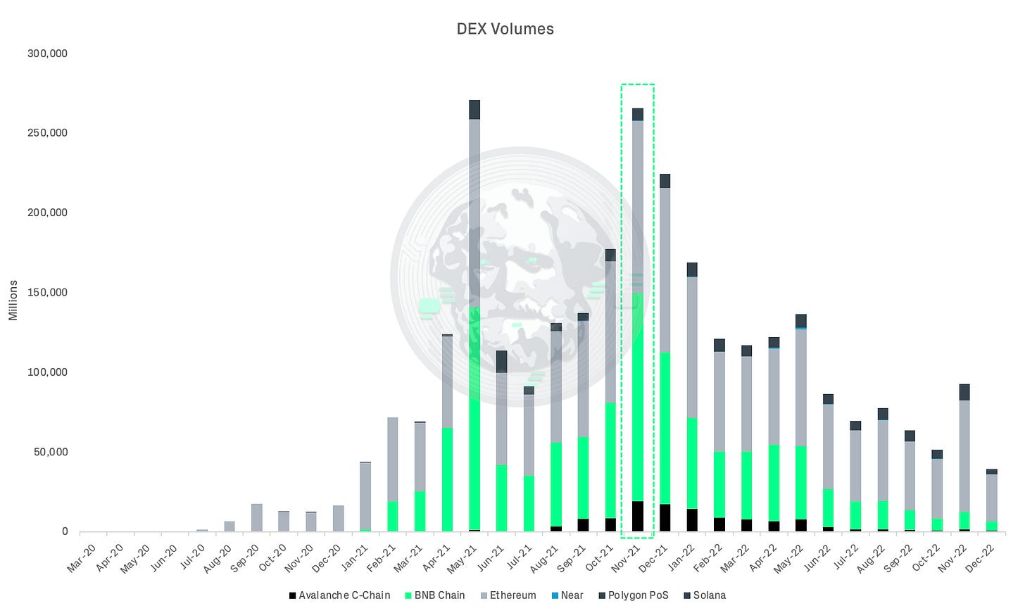At its peak in Nov 2021, BSC processed over $130B in DEX volumes —more than Ethereum ($107B) and most competitors combined. This wasn't driven by technological superiority but by Binance's ability to direct its users to a controlled ecosystem where they could trade, stake, and participate in DeFi without leaving the Binance sphere of influence.
