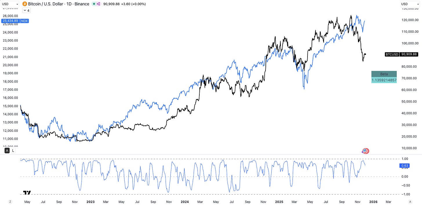 For Bitcoin, this linkage to equities is becoming even more important. The latest data show BTC’s 60-day beta to the Nasdaq has risen to 1.14, with the 1-month correlation now at 63%