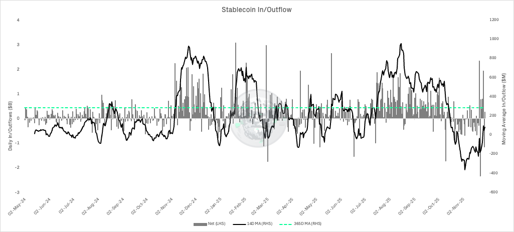 Meanwhile, onchain stablecoin flows remain subdued. The data shows that the 14-day moving average net inflow is currently about $80M (coming out of negative territory), far below the ~$286 M average over the past year.
