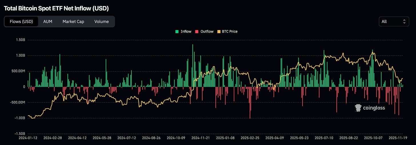 Bitcoin ETF flows and liquidity dynamics have shifted. After a reported $1.2B of outflows between 17-23 Nov, the late-November rally coincided with renewed net inflows. This combination of a BTC price rebound and ETF demand hints stabilisation and slow momentum.