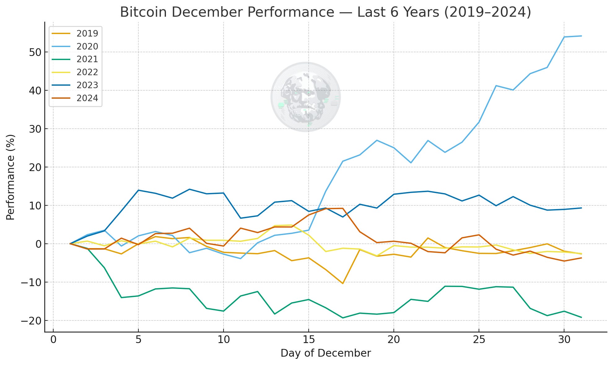 In strong years, mid-month has marked the point where upside momentum accelerates; in weaker years, it has been where early-month weakness stabilises; and in mixed or fading environments, like 2024, it has been the point where the market rolls over. Crucially, this is not a reliable “Santa rally” dynamic as seen in equities, but rather a moment of inflection, where positioning, liquidity and risk appetite tend to recalibrate into year-end. In other words, December doesn’t impose a bullish or bearish bias on Bitcoin, it simply amplifies the trend the market is already in, with mid-month acting as the pivot.