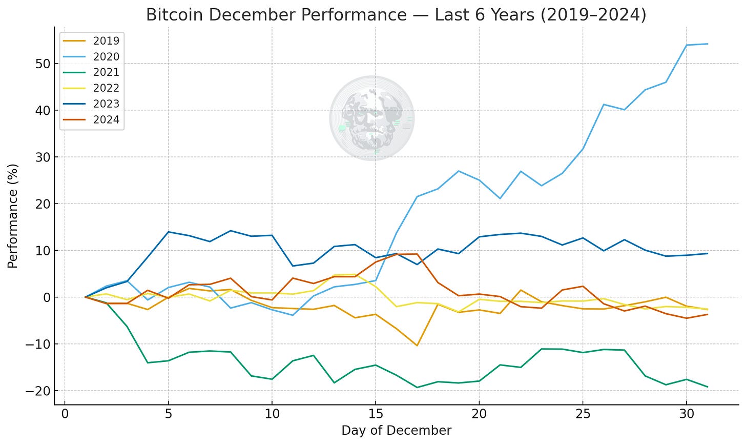 The complication now is December seasonality. When isolating the last six years of Bitcoin price action, a clearer pattern emerges: BTC often changes behaviour around mid-December, but the direction of that shift depends entirely on the prevailing liquidity regime.