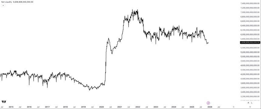 The medium-term outlook still comes down to one thing: liquidity. U.S. net liquidity, defined as the Fed’s balance sheet minus the Treasury General Account and the Reverse Repo facility, sits near $5.65 trillion, well below its 2021–2022 peak, and continues to grind lower.