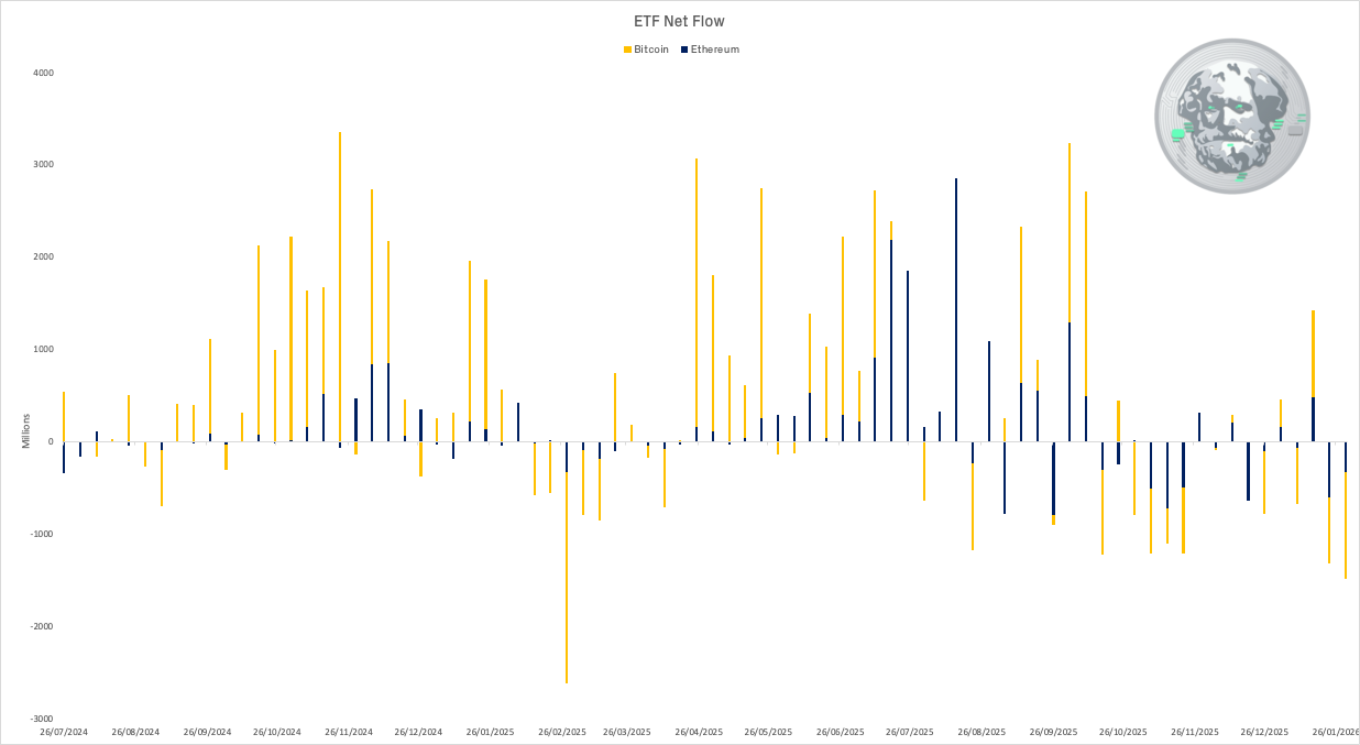Flows into institutional crypto products turned deeply negative. Bitcoin-focused ETFs saw $818 million in net outflows on Jan 29 alone – the largest single-day redemption on record. Ethereum ETFs followed suit, with $327 million in redemptions that same week.