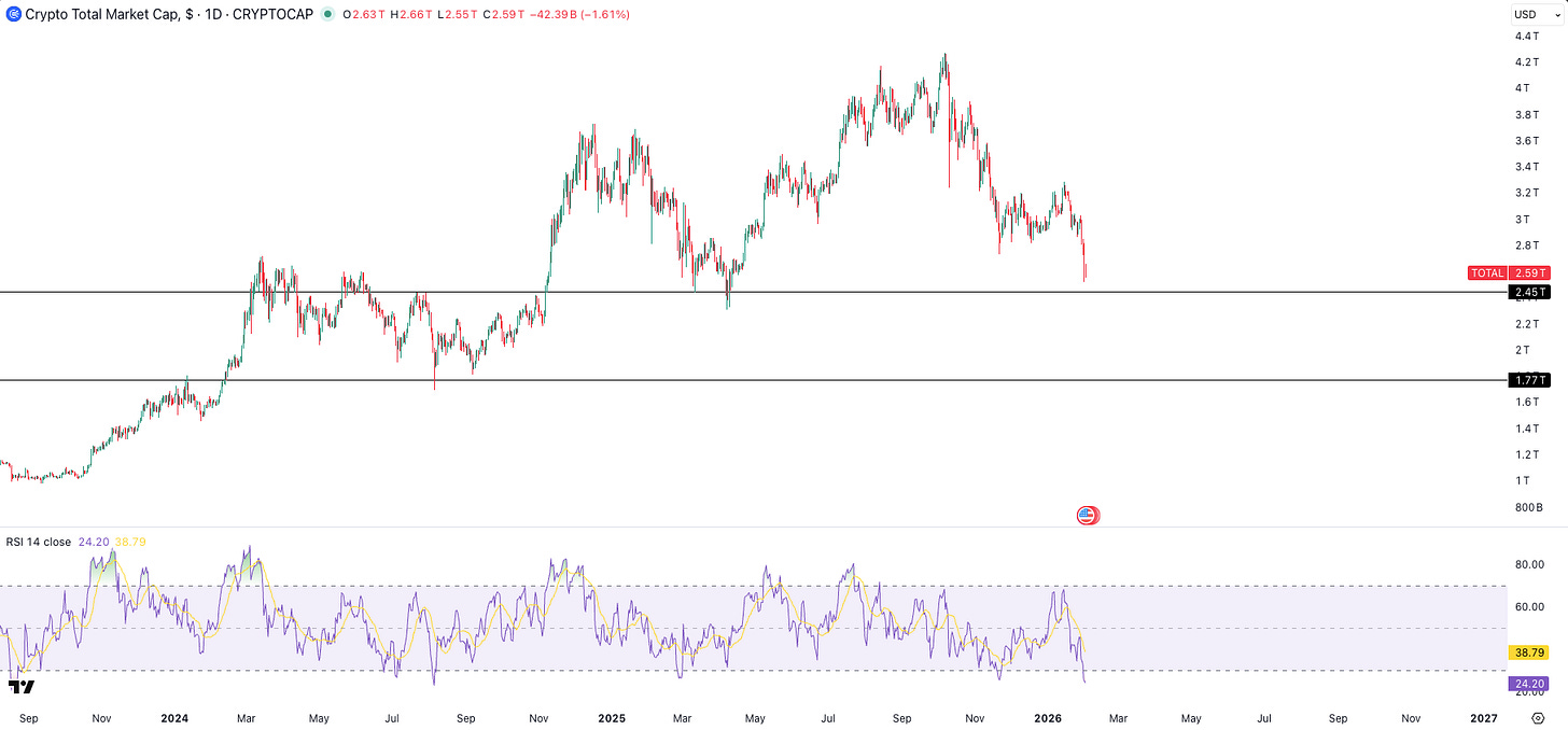 Broader market capitalisation is also teetering on a crucial threshold. The total crypto market cap has slipped below $3 trillion and is fast approaching a structural support trendline that has underpinned the market since 2024.